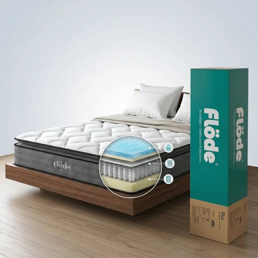 Colchón Flöde Plus 2 plazas con resortes pocket independientes que brindan soporte personalizado y reducen la transferencia de movimiento. Se presenta en caja facilitando su traslado. Su acolchado de alta calidad asegura confort, durabilidad y descanso