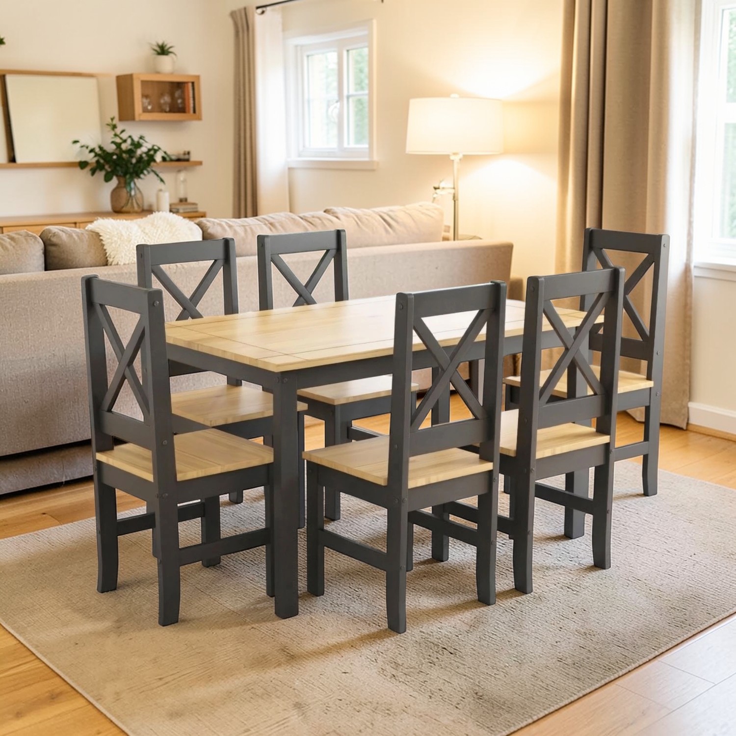 Fabricado íntegramente en madera maciza de pino, resistente y duradera. Sillas con diseño en cruz, un estilo clásico y elegante que aporta personalidad al comedor. Estructura firme y sólida, pensada para uso diario y larga vida útil. Terminación cuidada que resalta la belleza natural de la madera. Diseño atemporal que combina fácilmente con estilos modernos o rústicos. Conjunto cómodo y funcional.