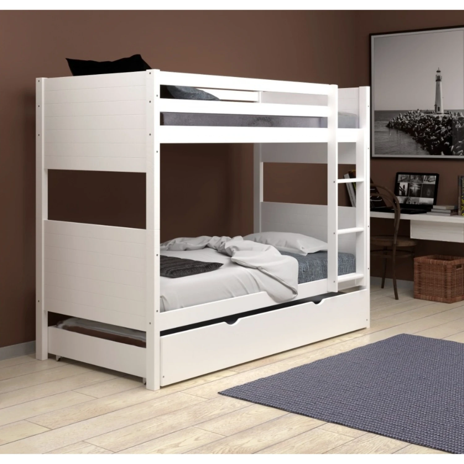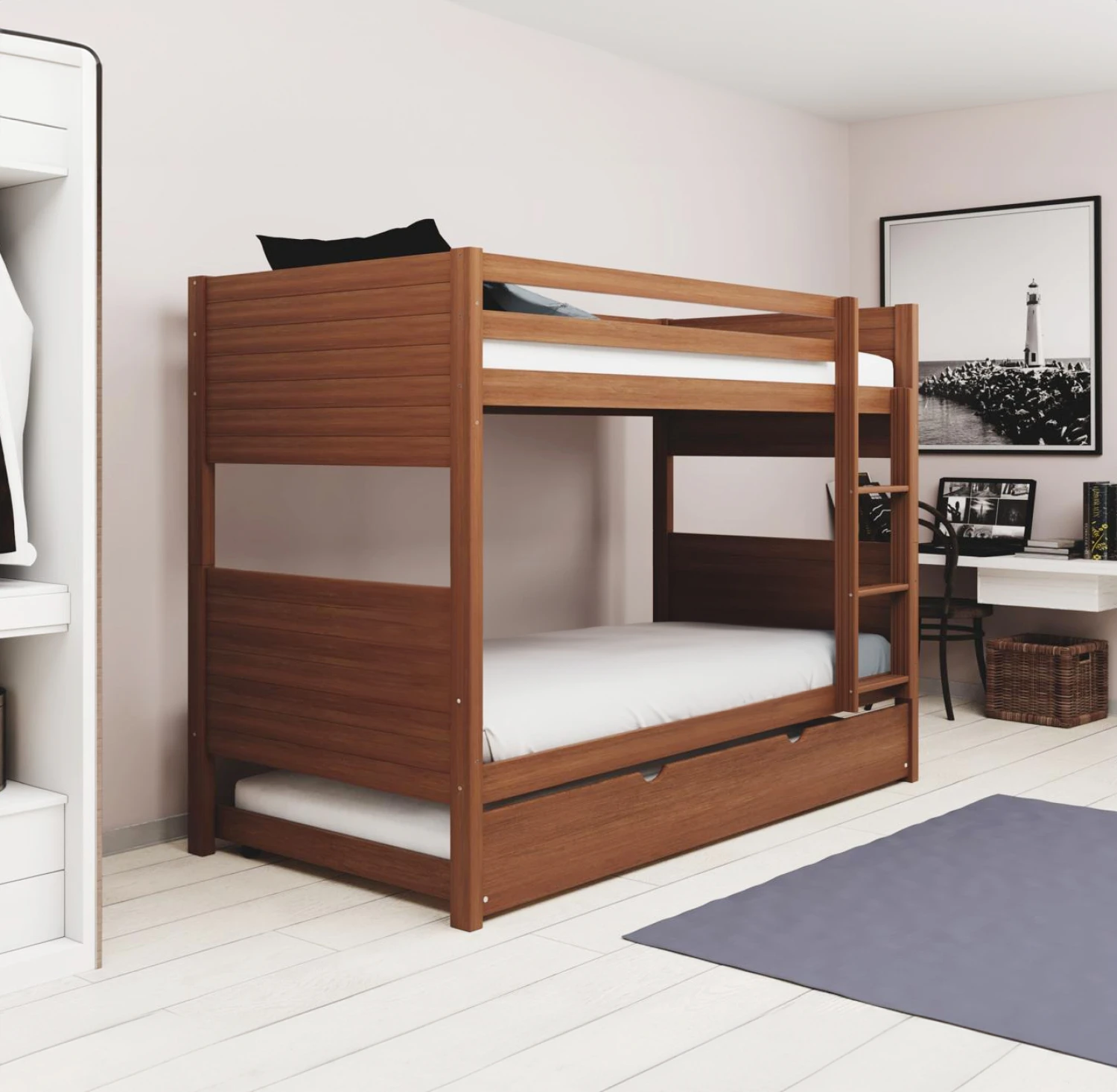 Cucheta en Madera con cama auxiliar. Soporta hasta 110Kg cama superior e inferior / 90Kg cama auxiliar.